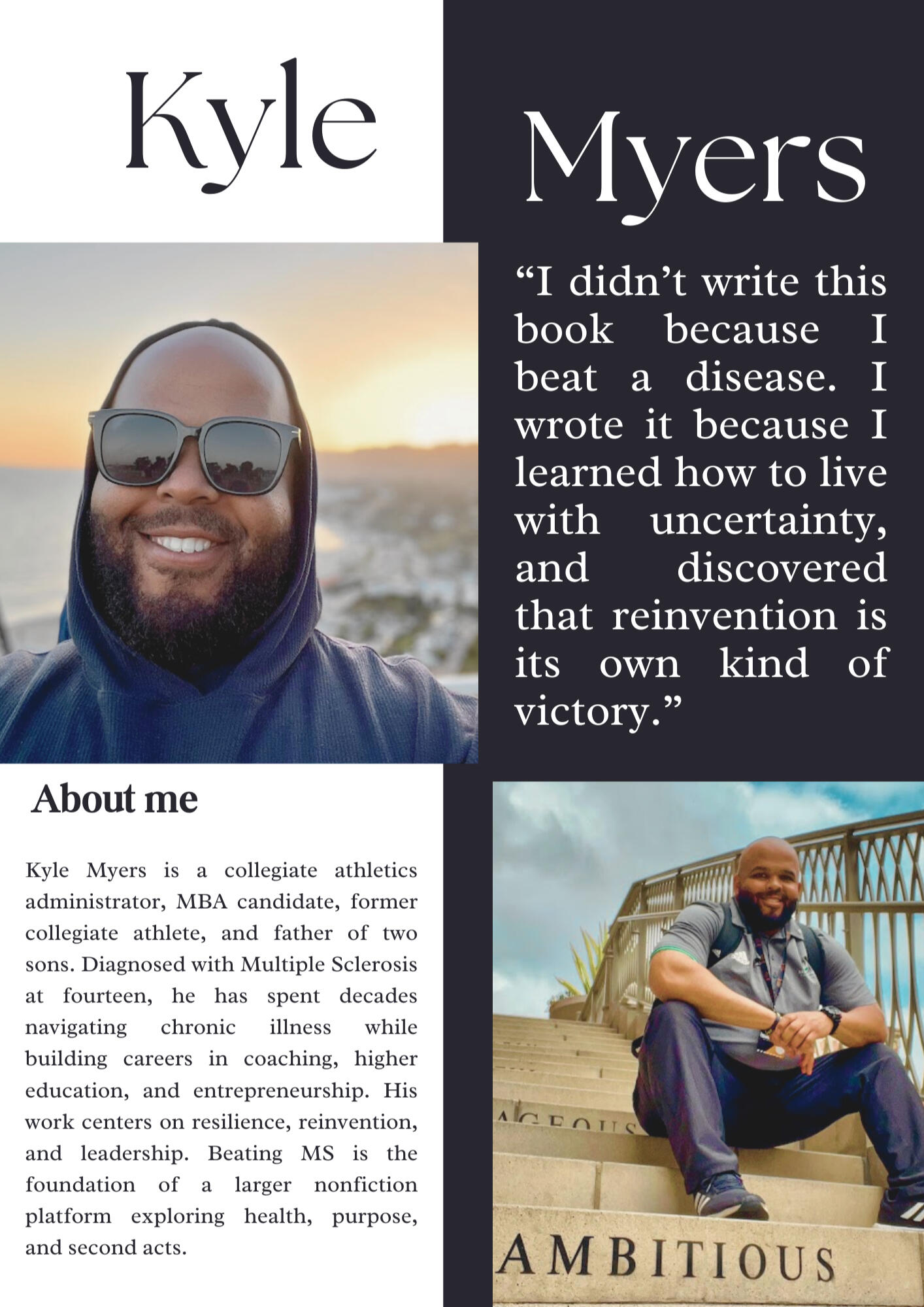 BEATING MS is a 72,000-word narrative nonfiction work blending cinematic storytelling with lessons on adaptation, identity, and purpose.Diagnosed with Multiple Sclerosis at fourteen, I watched the future I’d built as a young athlete disappear overnight. Over two decades, I rebuilt my life through coaching, higher-education leadership, fatherhood, entrepreneurship, and learning how to inhabit a body that no longer followed rules. Beating MS chronicles my transformation. It moves through locker rooms, hospital corridors, frozen highways, job interviews, and households, while exploring the psychology of resilience and reinvention.The book resembles the lineage of intimate health narratives like When Breath Becomes Air, while expanding into leadership and second-act territory for readers navigating illness, burnout, disability, caregiving, or professional pivots. Each short chapter ends with subtle reflection rather than instruction, allowing the story to drive insight.Beyond the manuscript, I’ve developed a companion list of works, including a reflection-based workbook, a keynote and motivational talk, and short audio segments based on the book’s themes.